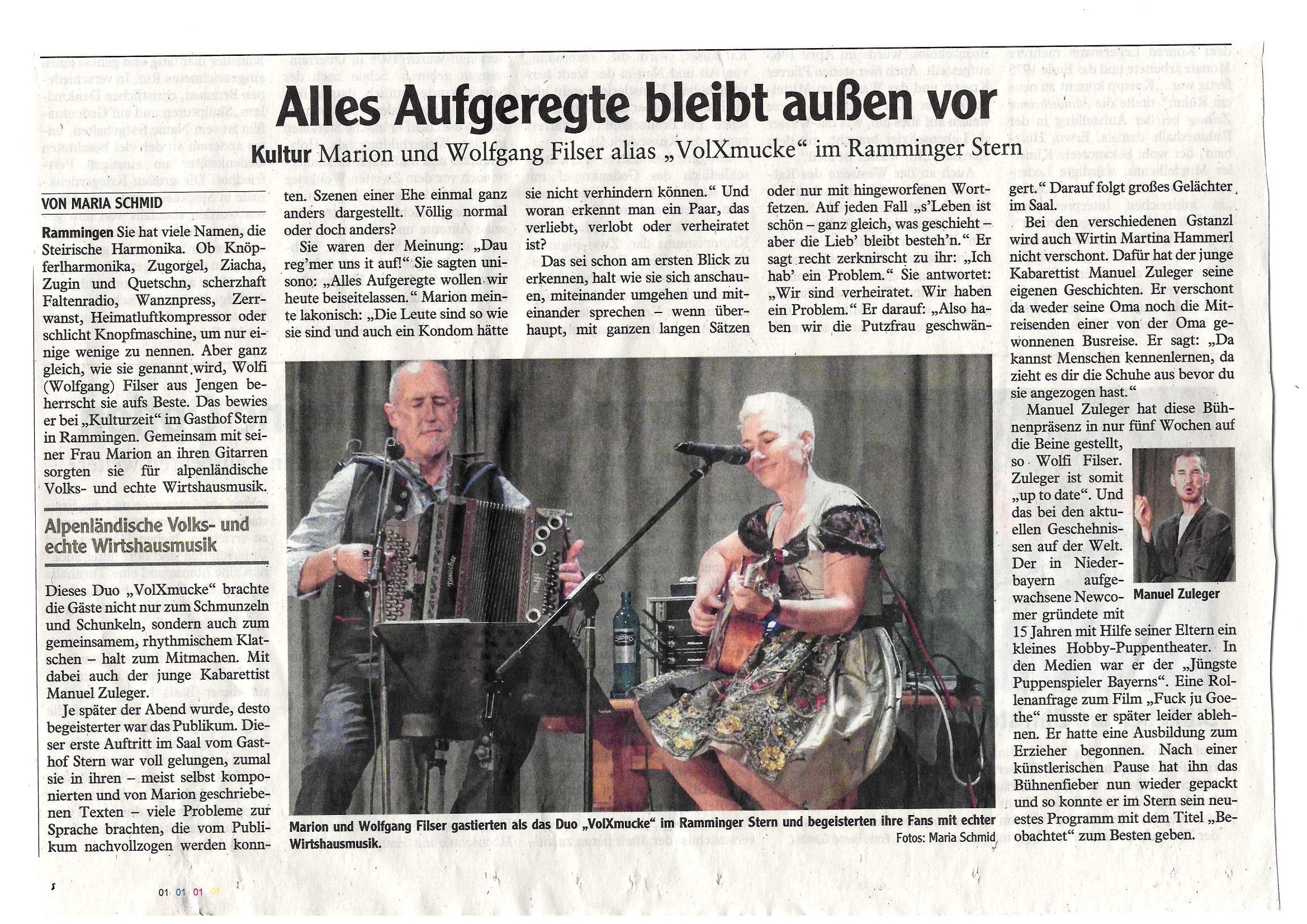 Der „VolXmucke-Virus“ hat mich ordentlich infiziert, weshalb ich mit meiner Frau die gleichnamige Gruppe gegründet habe. Mit Steirischer Harmonika und Gitarre, aber vor allem viel Gesang, unterhalten wir in bester Wirtshausmanier mit frechen Gstanzl'n und wunderbaren Harmonikamelodien. VolXmucke ist bei „Drum herum“ in Regen zu hören, wir spielen bei Geburtstagen, Firmenfeiern, als Biergartenunterhaltung und heuer bereits zum vierten Mal bei der Veranstaltung „Zamm gschpielt auf d´Nacht“, die von mir organisiert und ins Leben gerufen wurde. Ein Abend mit handg‘machter Musik und vielen unterschiedlichen Gruppen.