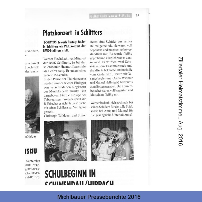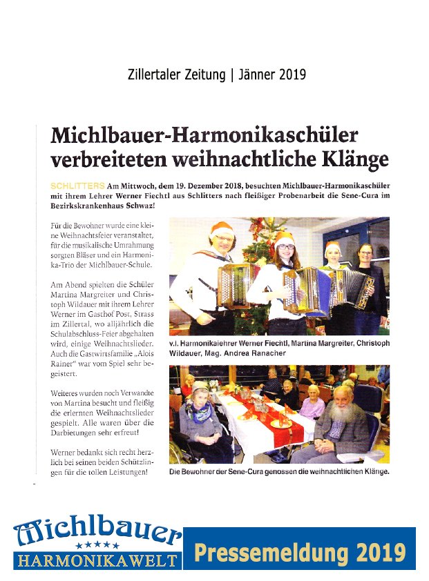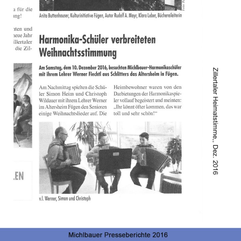 Am Samstag, dem 10. Dezember 2016, besuchten Michlbauer-Harmonikaschüler mit ihrem Lehrer Werner Fiechtl aus Schlitters das Altersheim in Fügen.
