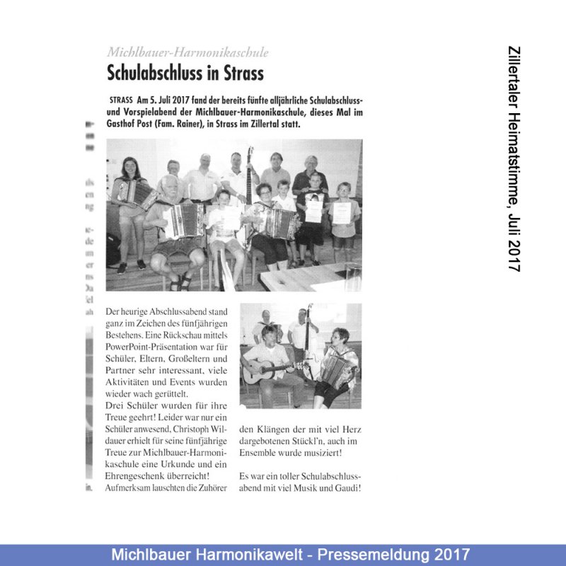 Am 5. Juli 2017 fand der bereits fünfte alljährliche Schulabschluss – und Vorspielabend der Michlbauer – Harmonikaschule, dieses Mal im Gasthof Post, in Strass im Zillertal statt.