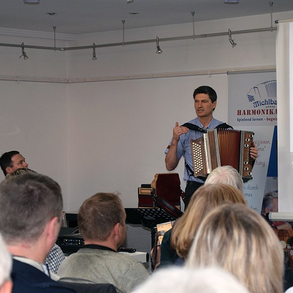 In diesem Praxis-Workshop mit dem Schwerpunkt „Harmonien und Tastenbelegung“ entdeckst du, welche Begleitakkorde und Töne sich auf deiner Harmonika befinden.