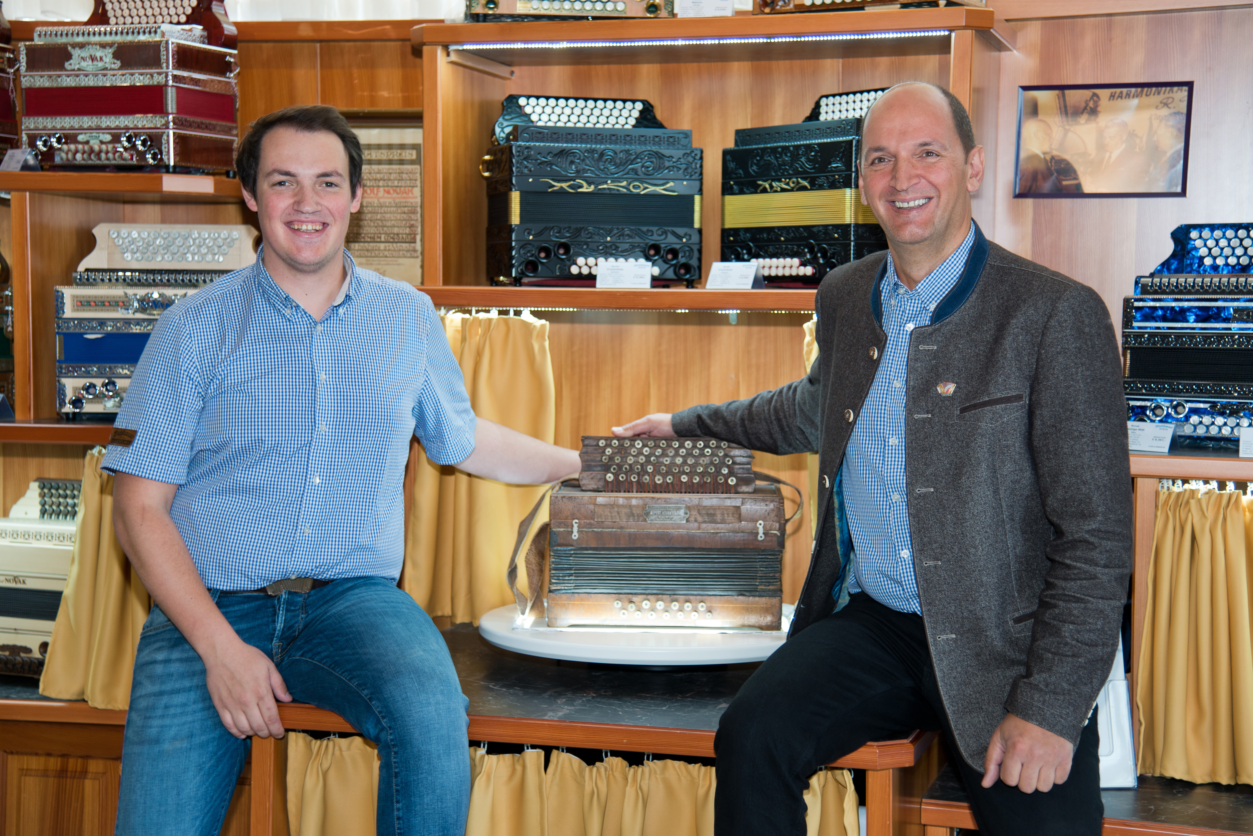 Bildtext 2: Österreichs älteste Harmonikaerzeugung, „Novak-Harmonika“ in Klagenfurt, wurde heuer vom größten Anbieter für Harmonikaschulen, Michlbauer GmbH mit Sitz in Reutte/Tirol übernommen. GF Heinrich Schedler und sein Sohn Dominic werden die Geschicke des Unternehmens führen. In der Mitte die erste 5-reihige Steirische Harmonika, diese wurde um 1900 erstmals von Rupert Novak gebaut. (Bild: Michlbauer/Foto-Fritz)
