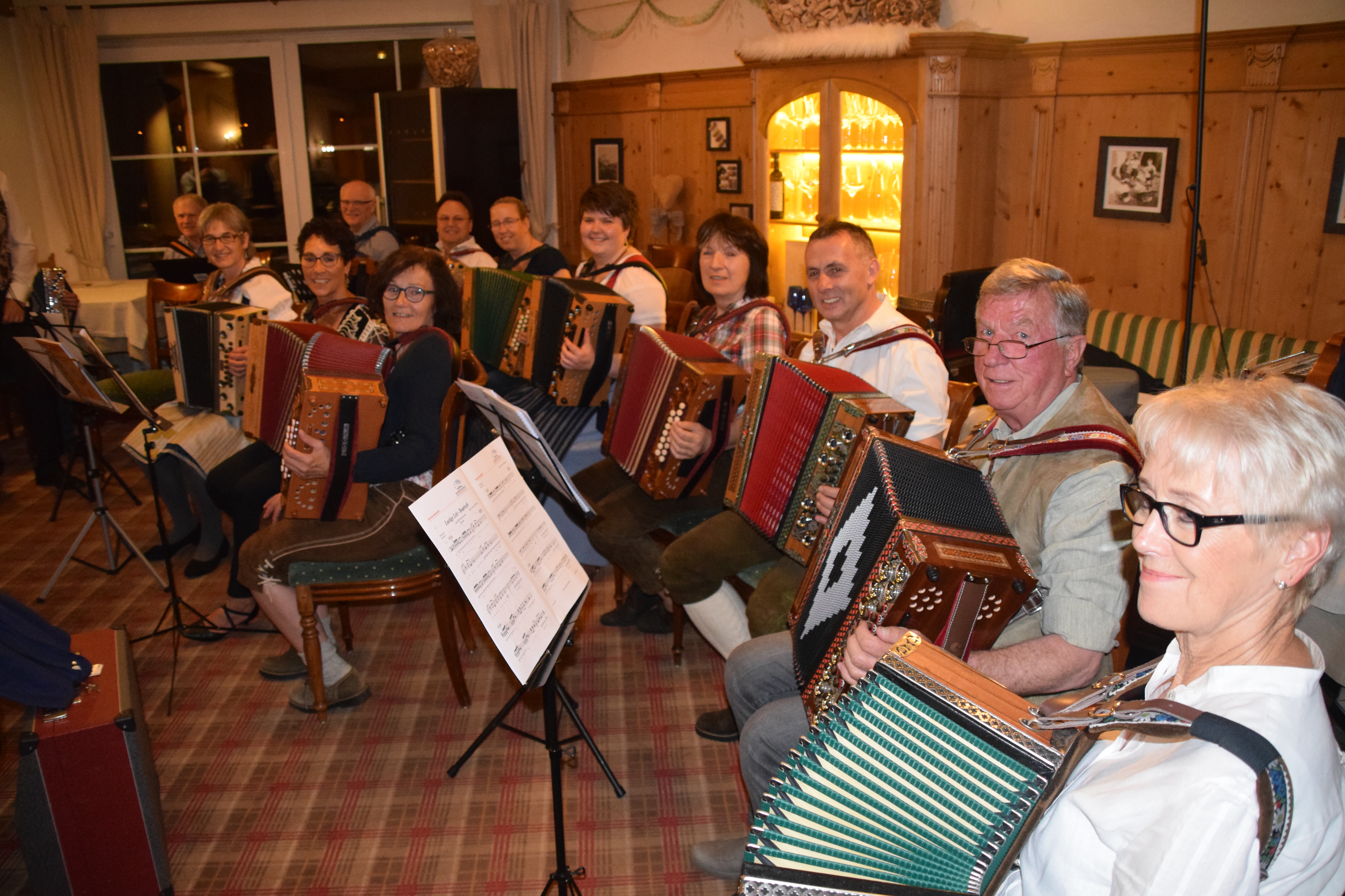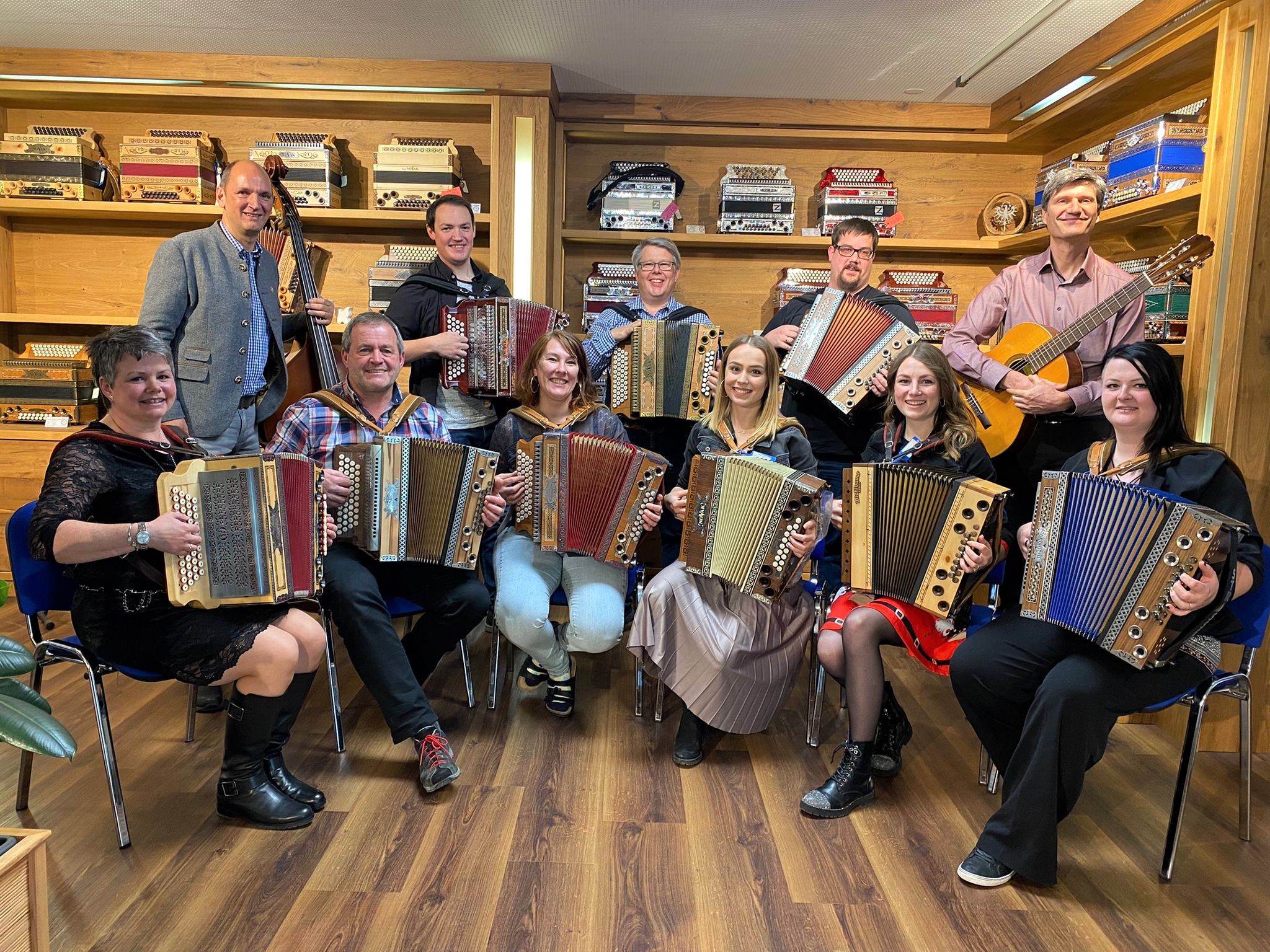Die Geheimnisse des Oberkrainer-Sounds kennenlernen und mit einer professionellen Gruppe musizieren konnten kürzlich 11 Teilnehmer beim ersten Oberkrainer-Spezial-Seminar in der Michlbauer Harmonikawelt in Höfen. Franci Kolar, ein vielseitiger Musiker und Lehrer leitete gemeinsam mit Rene Brilej, dem Chef der „Untersteirer“ und Inhaber der Firma Südklang Harmonikas dieses 2-tägige Seminar. Beide kommen sie aus der Untersteiermark, der nördlichsten Region in Slowenien. Am ersten Tag erhielten die interessierten Teilnehmer einen umfassenden Einblick in die Geschichte und dem musikalischen Aufbau der Oberkrainer-Musik und deren Instrumente. In größeren und kleineren Gruppen wurden dann mehrere Stücke erarbeitet. Ein Schwerpunkt galt hier der typischen Oberkrainer-Begleitung. Am späten Nachmittag stießen auch die Bläser der „Untersteirer“ dazu. Sie standen den Seminarteilnehmern als Sparring- Partner zur Verfügung und übten gemeinsam mit ihnen die ersten Stücke in Oberkrainer- Besetzung. Mit slowenischen Weinen, slowenischen Volksliedern und regionalen Musikschmankerln ließ man dann den ersten Tag gemütlich ausklingen.