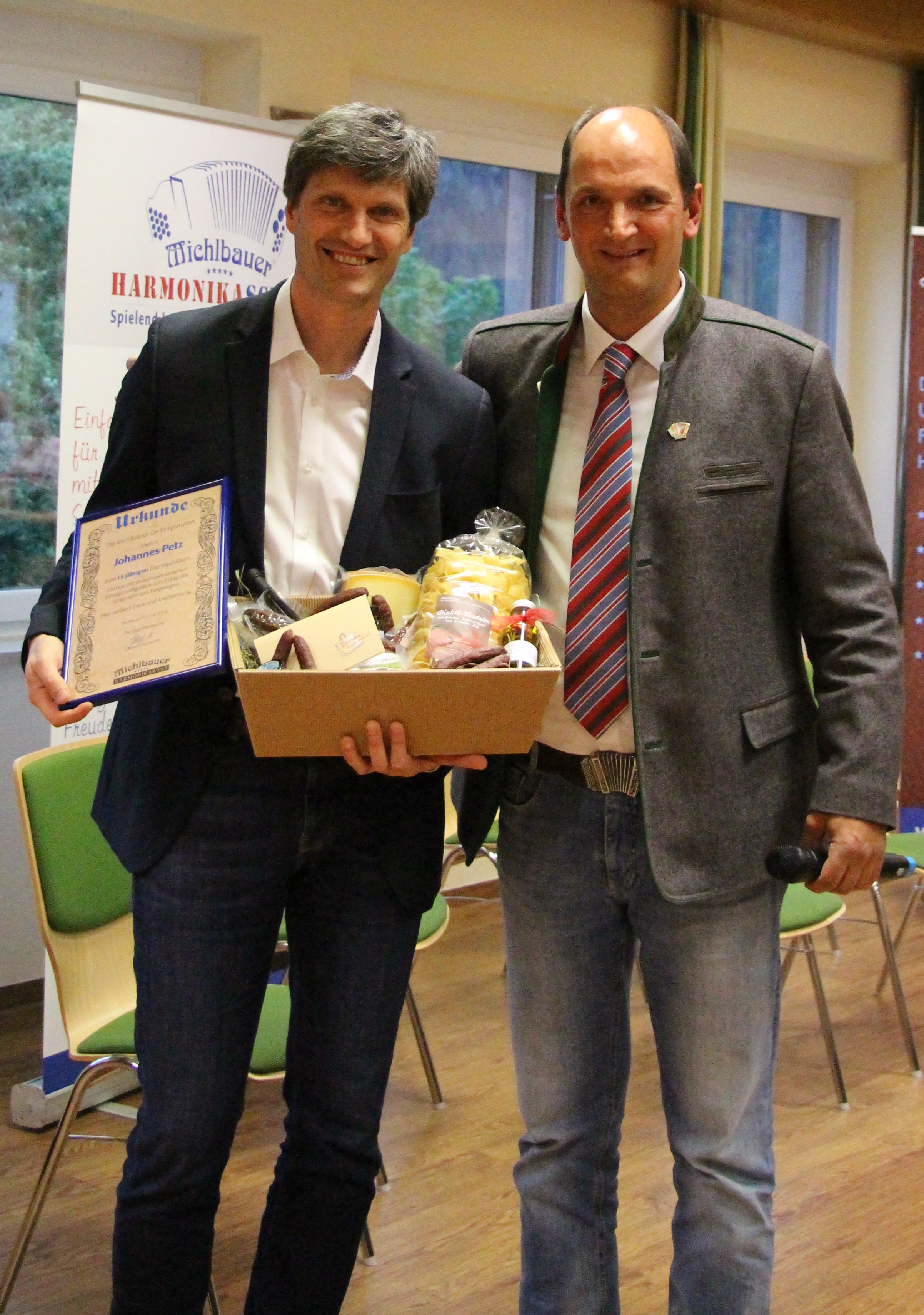 Zur Überraschung von Harmonikaschule Direktor Johannes Petz, wurde auch ihm für seine 15-jährige Lehrertätigkeit gratuliert. GF Heinrich Schedler, selbst begeisterter Musikant, dankte Johannes Petz für seine Tätigkeit als Lehrer und schulischen Leiter, der seit Anfang an dabei ist und überreichte nebst Urkunde auch ein Präsent seitens der Michlbauer Harmonikawelt.