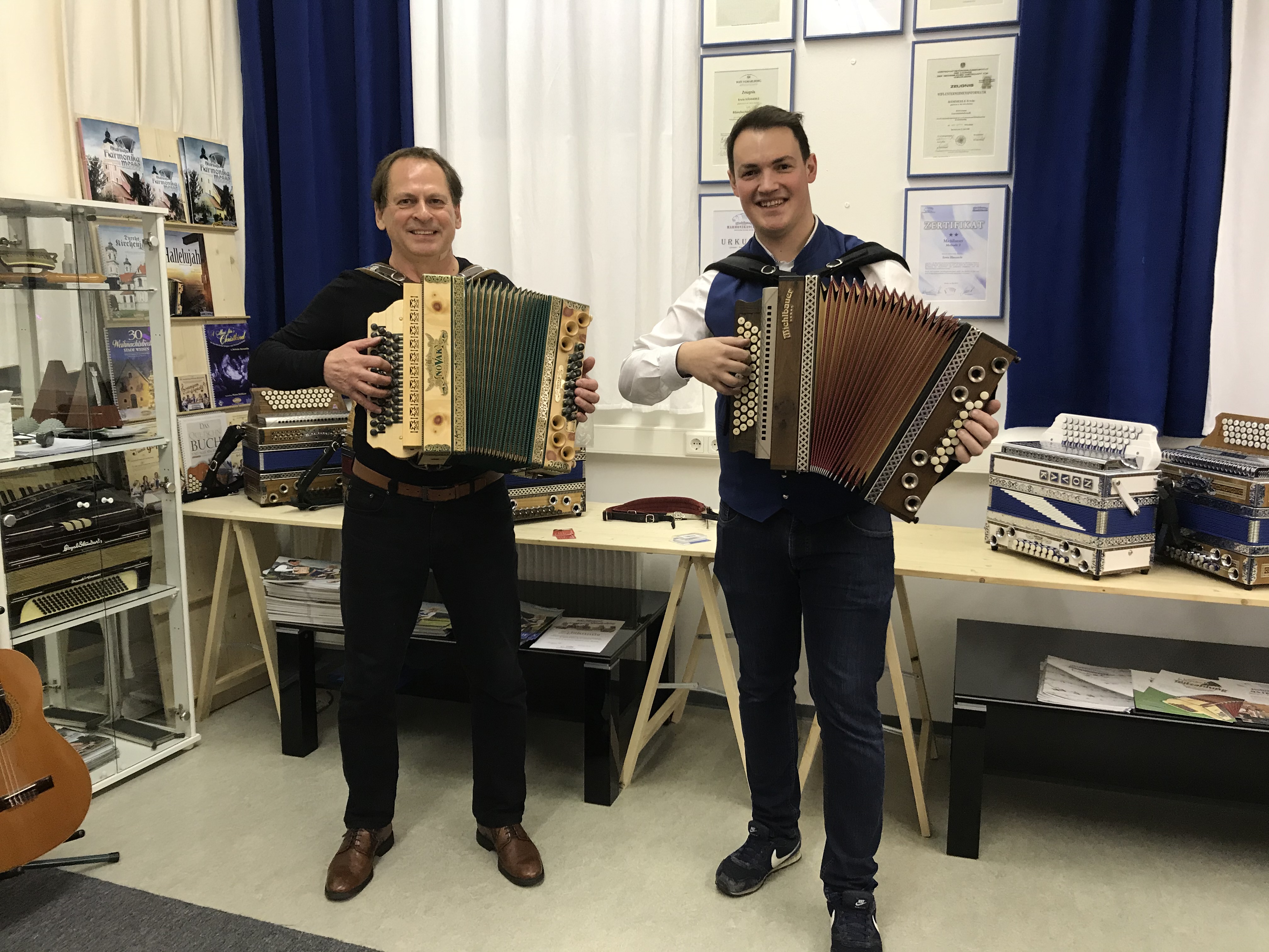 Erwin Hämmerle (li) eröffnete kürzlich die erste spezielle Harmonika-Schule in Vorarlberg. Gemeinsam mit Dominic Schedler, Harmonikabauer und Steirische-Lehrer von der Michlbauer-Harmonikawelt mit Sitz in Reutte/Tirol, zeigte er den Besuchern, was auf der Steirischen möglich ist. (Foto: Michlbauer; Abdruck honorarfrei)