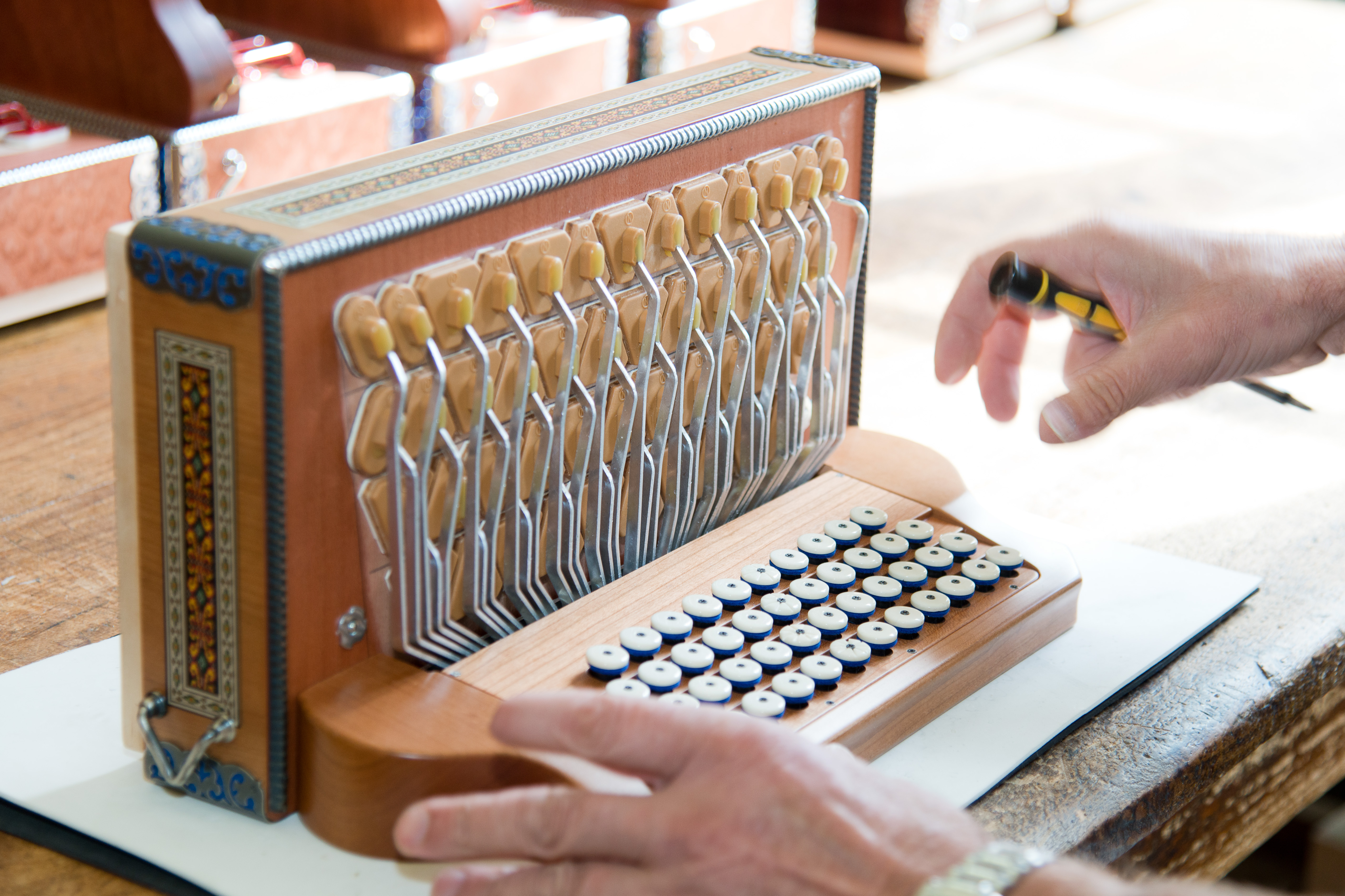 Vier Jahre später – 2018 – wurde Abschied von Höfen genommen und das „Harmonika-Kompetenz-Zentrum“ in Reutte eröffnet. Und wäre das alles nicht genug, erfolgte 2020 mit der Übernahme von Österreichs ältester Harmonikaerzeugung, der Firma Novak Harmonikas in Klagenfurt, der Einstieg in die eigene Produktion von Steirischen Harmonikas. Harmonikamacher Dominic Schedler übernahm die Leitung der Produktion.
