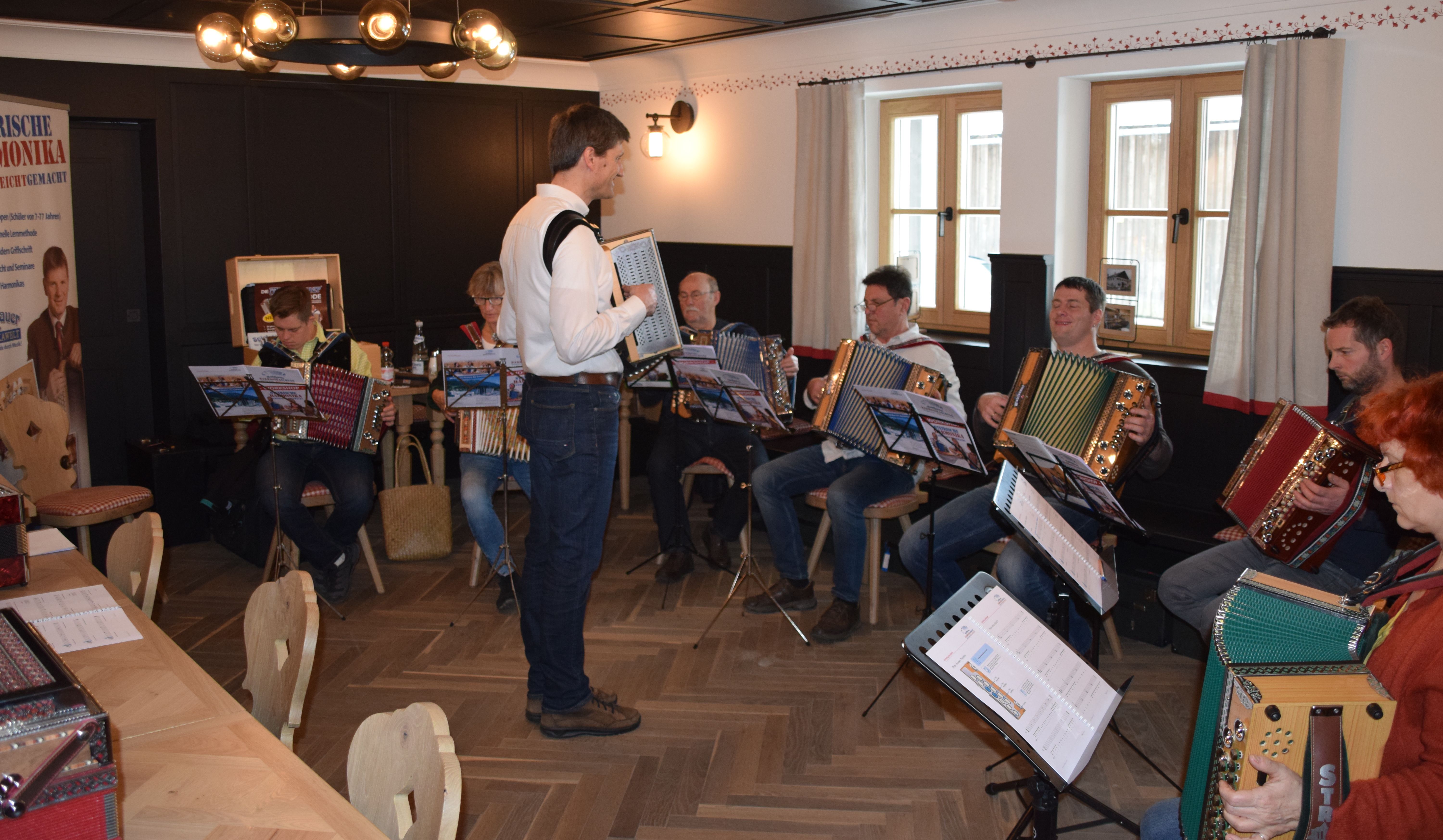 Künftig wird die Musiklandschaft in dieser Region allerdings um eine Facette reicher. Denn ab sofort besteht für alle Musik-Interessierte zwischen 7 und 87 Jahren die Möglichkeit die Steirische Harmonika auch nach der erfolgreichen Michlbauer-Methode zu erlernen. Der Startschuss dazu fiel am 3. Februar im Gasthof Fuchs in Mauth bei einem kostenlosen Schnupper-Workshop. Bis von Passau waren Teilnehmer angereist um die ersten Erfahrungen und Eindrücke auf der Harmonika zu sammeln. Johannes Petz, Direktor der Michlbauer Harmonikaschule war von Tirol angereist und leitete gemeinsam mit Andreas Gassler diesen Workshop. Andreas ist nicht nur in Mauth aufgewachsen, sondern er wird auch ab sofort direkt in Mauth als Harmonikalehrer tätig sein. Neben seinem Hauptberuf als Bäcker absolvierte er bei Michlbauer letztes Jahr erfolgreich die Ausbildung zum zertifizierten Harmonikalehrer.