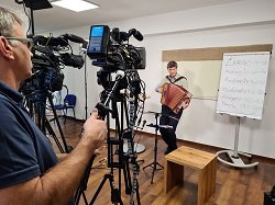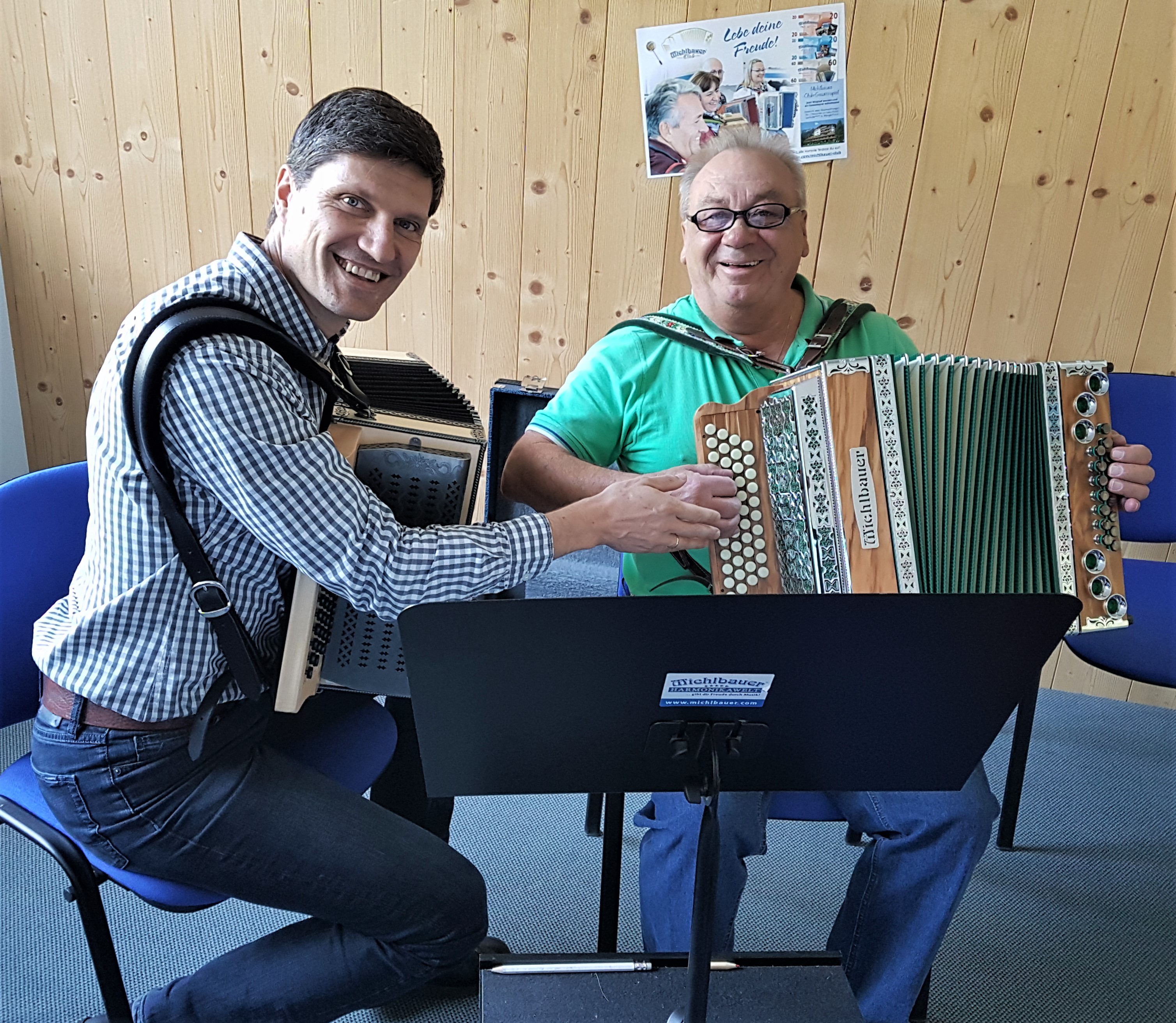 Michlbauer Harmonikaschule Direktor Johannes Petz im Unterricht mit begeistertem Schüler Franz Ruprecht.