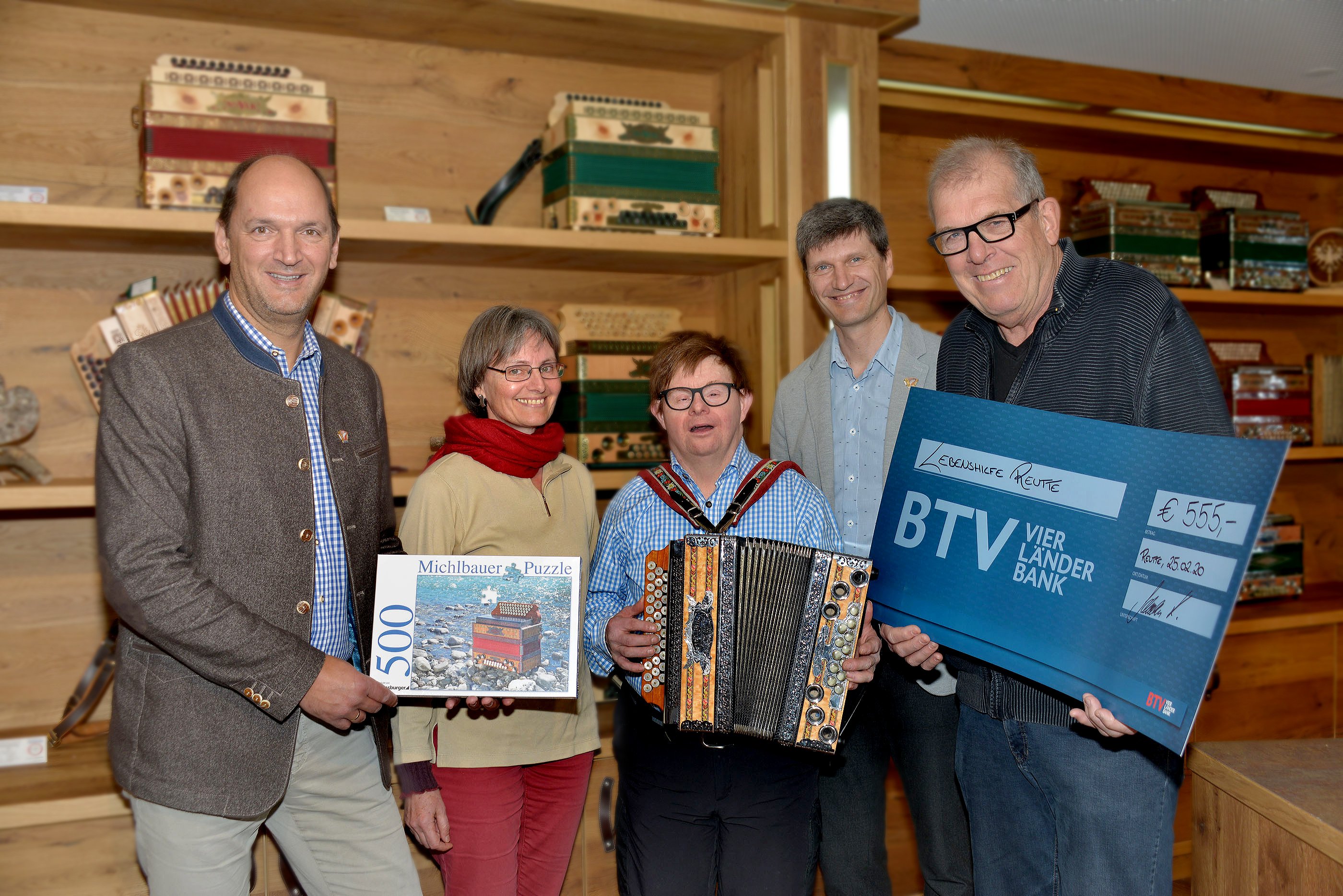 Zu einem überraschenden Geldsegen kam kürzlich die Lebenshilfe Außerfern. Das heimische Unternehmen Michlbauer GmbH (Harmonikaschule mit Sitz in Reutte) hat den in der Adventszeit 2019 erwirtschafteten Erlös aus dem Verkauf von Harmonikapuzzles großzügig aufgestockt und konnte somit vergangene Woche dem sehr erfreuten Kassier der Lebenshilfe Reutte Anton Brandner einen Scheck in Höhe von 555 Euro überreichen. Im Bild v.l.n.r.: Michlbauer Geschäftsführer Heinrich Schedler, Harmonikalehrerin Marie-Luise Witting mit ihrem begeisterten Harmonikaschüler und Lebenshilfemitglied Wendelin Prantl, Musikschuldirektor Johannes Petz und Lebenshilfe-Reutte-Kassier Anton Brandner.