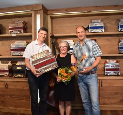 Die Ziehung des Gewinners, in diesem Fall war es eine Gewinnerin, erfolgte genau 102 Tage nach der Eröffnung, am 9.7.2018 in der Michlbauer Harmonikawelt Reutte. Schon bei der telefonischen Überbringung dieser freudigen Nachricht war die Gewinnerin, Renate aus dem Großraum München sprachlos. Bereits wenige Tage später konnte sie ihr neues Herzstück persönlich in Empfang nehmen. Bei der feierlichen Übergabe der Strasser Harmonika durch Geschäftsführer Heinrich Schedler und Harmonikaschule Direktor Johannes Petz flossen auch Tränen der Freude. „Ich habe zuvor noch nie etwas gewonnen – und jetzt gleich eine neue und so schöne Harmonika. Ich kanns einfach nicht glauben“, so die überglückliche Gewinnerin. Sie erzählte weiter, dass sie eine Freundin nach Reutte in die Harmonikawelt mitgenommen hatte. Nach dem Besuch in der Michlbauer Harmonikawelt entschloss sie sich dann vor ca. zwei Monaten gleich eine Harmonika zu mieten und es sich mit der Michlbauer Methode selbst beizubringen. Bereits ihr Vater hatte früher schon auf einer Harmonika musiziert – was auch der Grund und Auslöser war, warum sie dieses Instrument gerne lernen wollte.