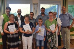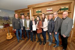 Bild 1: Heinrich Schedler (Geschäftsführer Firma Michlbauer), Wolfgang Winkler (Bezirksstellenleiter Wirtschaftskammer Reutte), Jürgen Koch (Direktor Tiroler Fachberufsschule für Handel und Büro Reutte), LRin Beate Palfrader (Zuständig für Bildung, Kultur, Musikschulen, Erwachsenenbildung), Fabienne Schedler (Lehrling des Monats Februar 2020), Jasmin Schedler (Ausbilderin Firma Michlbauer), Günther Walch (Bgm. Steeg), Alois Oberer (Bgm. Reutte) und Sieghart Wachter (Kammerrat Arbeiterkammer Tirol und Bgm. Musau) bei der Auszeichnungsfeier in Reutte.
