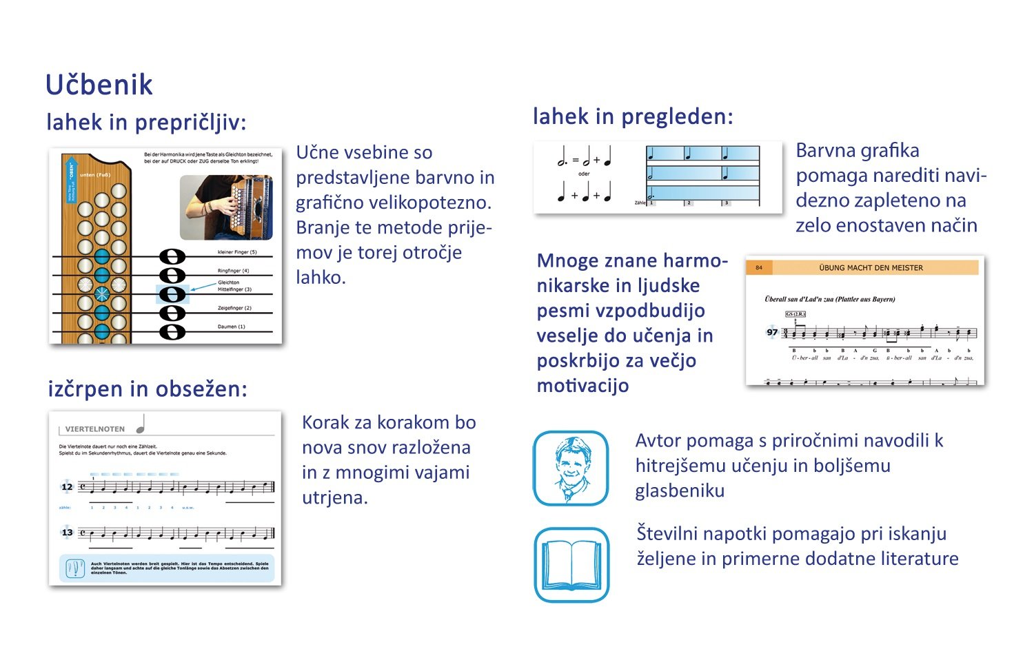 »Vsak, ki se želi naučiti igranja na diatonično harmoniko, lahko to stori tudi brez kakršnega koli predznanja« je prof. Florian Michlbauer dokazal že neštetokrat. Pogoji za to so predvsem veselje in navdušenje, vsekakor pa pravilni prvi koraki. Napačno naučene osnove je namreč težko popravljati. Nobenega glasbila se ni možno naučiti igrati na tako enostaven in hiter način, prav tako z nobenim glasbilom ne moremo v tako kratkem času igrati toliko pesmi kot z diatonično harmoniko. Iz teh razlogov je idealen inštrument za vse začetnike, ki končno želijo tudi sami igrati, najbolj priročna literatura zanje pa je ravno Michlbauerjeva metoda učenja. Ne glede na leta (7 ali 77 let), je to knjiga, primerna za vse starostne skupine.,