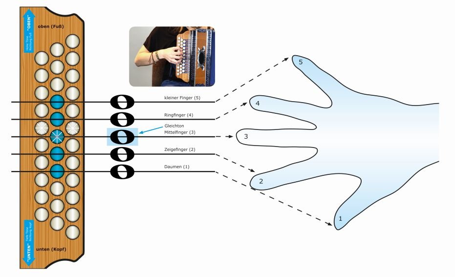 Im Praxisteil erfährst du die wichtigsten Grundlagen zur Haltung und Bedienung der Harmonika, sowie die theoretischen Grundlagen zum Lesen der Griffschrift.